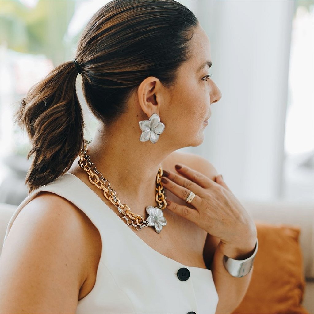 O Colar Flower Dourado, traz um pingente de flor moldado em alumínio, acompanhado por duas correntes que criam um contraste marcante: uma com banho dourado reluzente e outra em aço, trazendo modernidade e atitude.