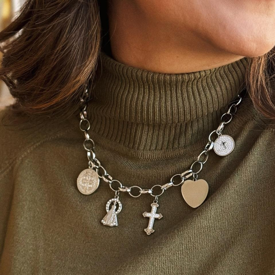 Uma joia que carrega história e estilo. O Colar Relíquia feito inteiramente em elo português hipoalergênico de alumínio, oferecendo leveza, durabilidade e conforto para o uso diário. Com aproximadamente 40 cm de comprimento, ele traz 5 pingentes, que conferem personalidade e sofisticação à peça.
