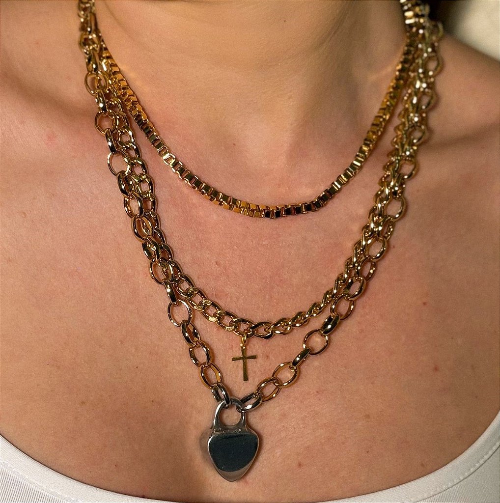 O design único deste colar destaca-se, por ser um mix perfeito de textura e comprimentos diferentes, tornando-o uma peça verdadeiramente especial. O colar Veronica Gold, tem 3 medidas de corrente, 45cm, 50cm, 55cm.com banho dourado, fecho em imã, e pingente em alumínio.